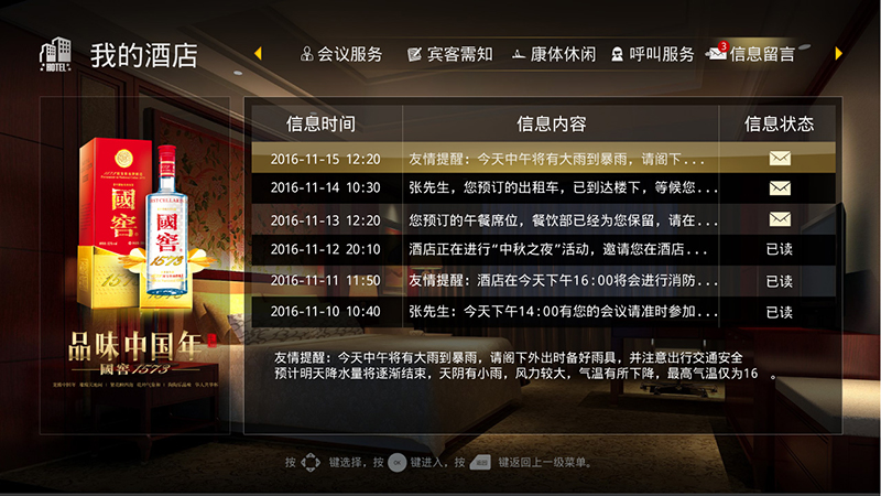 快速退房服务:酒店高效率服务无不受到顾客称赞,用户在客房按下退房开关时直接可以办理退房手续,通知服务人员对客房进行检查,结束后打印帐单,用户下楼买单离去,期间无需排队等待。