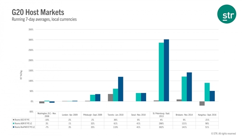 STR研究发现,主办G20峰会对酒店的平均每日房价(ADR)的影响比入住率更大。