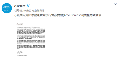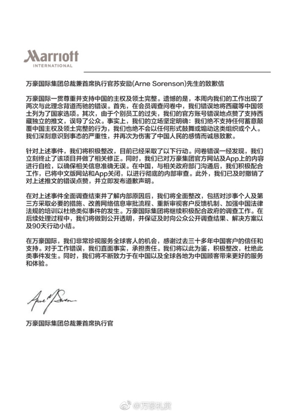 1月12日凌晨,万豪国际集团微博账号“万豪礼赏”发布该集团总裁兼CEO苏安励的致歉信。致歉信中称,“由于个别员工的过失,我们的官方账号错误地点赞了支持‘西藏独立’的推文,误导了公众。”