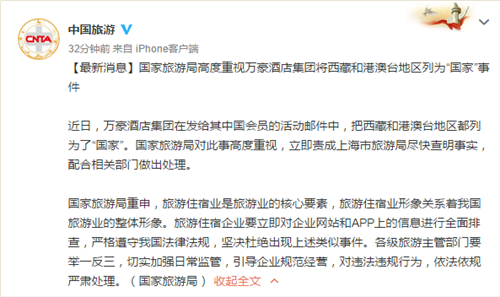 近日,万豪国际集团在发给其中国会员的活动邮件中,把西藏和港澳台地区都列为了“国家”。国家旅游局对此事高度重视,立即责成上海市旅游局尽快查明事实,配合相关部门做出处理。
