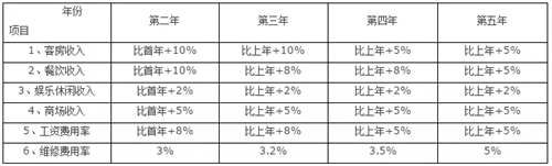 酒店首年可行性财务测算产生后,就可以轻松地测算出第二至第五年酒店经营情况的较为准确的数据,因为测算所依据的参数变化的占少数,不变的占多数,现将变化的参数列表如下予以说明: