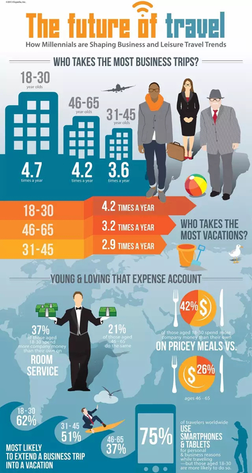 根据全球公司波士顿咨询集团(BCG)的研究报告,到2020年,商务旅客里面将有一半以上都是千禧一代。虽然这代人可能会受可支配收入的限制,但是他们会比年长的旅客更多地把旅行看成一种追求娱乐体验的手段。