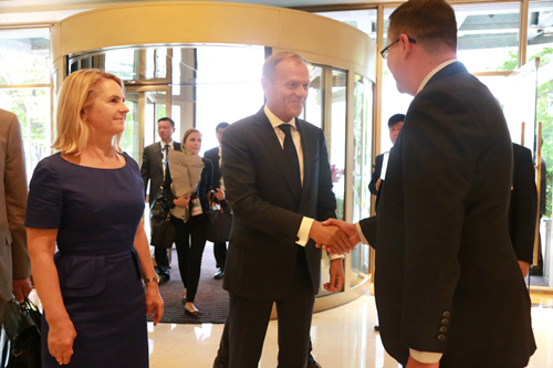 2016年9月3日下午5点,雅高酒店集团大中华区区域餐饮总监/山东区域运营总监柯瑞文、杭州索菲特西湖大酒店总经理范斯先生和酒店业主代表/副总经理竺丽萍女士,于酒店正门口热情迎接欧洲理事会主席唐纳德·图斯克与他的夫人玛乌格热塔。