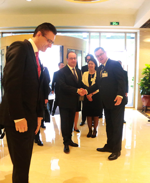 2016年9月4日下午12点30分,雅高酒店集团大中华区区域餐饮总监/山东区域运营总监柯瑞文、杭州索菲特西湖大酒店总经理范斯先生和酒店业主代表/副总经理竺丽萍女士,于酒店正门口热情迎接法国总统弗朗索瓦•奥朗德。