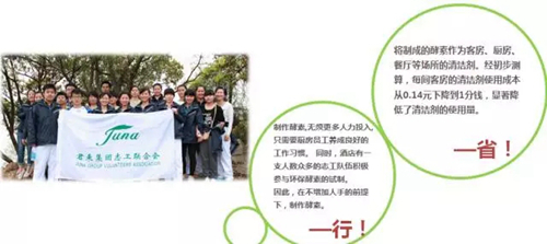 该饭店总经理曹兰兰说:“原来我们用清洁剂清洁客房,平均下来每一间房间花费0.14元,现在用了酵素后下降到了0.01元。”原来,酵素是一种酶,具有净化和抗菌的功能。无锡君来湖滨饭店以每天用剩的大量的果皮和蔬菜为原料,加上黑糖或者红糖制作成酵素清洁剂,应用在客房、公共区域卫生间、厨房、地面、墙砖的清洁上,既卫生又环保。“这种变废为宝,不仅减少了垃圾的排放,还为饭店节省了大量清洁费用,这一饭店环保节支的新尝试值得我们学习。”多位与会嘉宾表示。