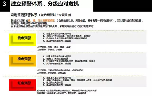 刘蕾认为,酒店要从根本上提升风险防控能力,把危机隐患扼杀在萌芽状态,而不是后续应对。可将舆情风险评估纳入日常风险评估中;实行舆情风险通知单制度;全面总结酒店业舆情风险类型;重要决策、项目、活动前开展风险评估等。“酒店业的很多重大投诉都发生在夜晚、凌晨时分,酒店平时就要培训、训练员工监测应对舆情,建立黄色、橙色、红色预警分级管理体系,科学分析研判,分级应对,把舆情管理工作常态化。