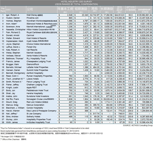 据AETHOS咨询集团的一份最新报告, 该公司发布了其第20次对酒店首席执行官们的薪酬审查,发现2015年CEO的平均收入超过600万美元,同时该行业的平均股权拥有量在同一时期超过4000万美元。 该公司还采用绩效薪酬模型评估了38位CEO的绩效,考虑市值,股票升值,EBITDA增长和直接薪酬总额,以确定这些领导人是否赢得了他们的报酬。