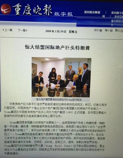 在特朗普胜出总统大选之后,8年前的一则新闻简讯在特朗普胜选美国总统之后,再度刷爆朋友圈。这则简讯的主要内容是:2008年2月,中国房地产十强企业恒大地产集团与美国最大的地产开发商之一特朗普集团及中国香港房地产投资公司东方地产集团(OPG)正式结盟,在中国主要超大型城市的顶级豪宅及超高建筑领域展开合作。