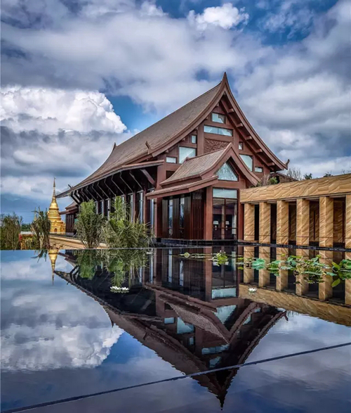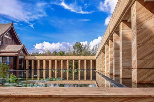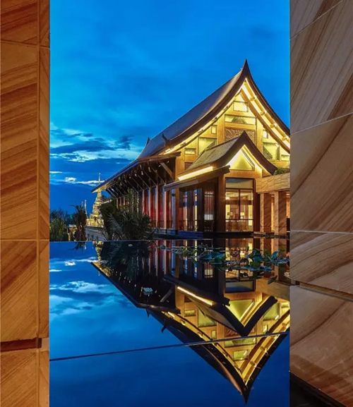 第二个例子:西双版纳万达文华度假酒店,我们想力求凸显独特的地域文化特色来延续当地的文脉。这个项目是在西双版纳的山林之中,整个建筑可以说是融于自然,成为那里风景的一部分。在设计之中,我们研究了很多不同种类的傣族元素,并运用在方案之中,酒店的屋顶、房梁、包括环境内饰等等,都可以体会到民族文化的氛围,当然,我们也结合了一些现代的手法,更好的把这种文化和当地的生活方式通过建筑语言去表达,让去那里居住的人获得高品质的原生态的度假体验。