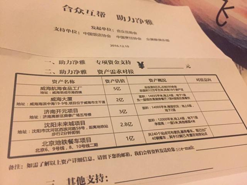 “帮扶计划”共列出净雅5项资产,其中威海大厦(建于2009年)、济南开元项目(建于2010年)和沈阳未来城项目(建于2012年),属于净雅自有物业,以前用于经营门店,均位于当地黄金地段,占地面积1万平米以上,共估值7.8亿元。威海航海食品工厂建于2010年,占地500亩,曾用于净雅海参和鱼虾等海鲜产品的储藏和初加工,估值5亿元。北京地铁餐车项目是2013年8月净雅为谋求转型,通过收购“天天见面”推出的大众餐饮项目,可在北京240个地铁站点提供餐车服务。