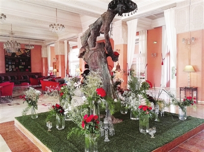 马拉喀什的东方文华酒店,简直就是一座花园。这家酒店给记者的印象是以白色、绿色为主调。餐桌布是白色的,上面摆放着新鲜的结着橄榄的枝叶和黄的绿的柠檬,虽然北非正午的日头又毒又烈,但在白色的遮阳伞下,这清新的颜色,加上不远处碧蓝的池水,心立马静了下来。可能是受摩洛哥传统建筑的影响,一进门,大厅中央一定是一池水,围绕着池水就餐。因而我们在文华和四季酒店用午餐时,都是在室外,离游泳池不远。雷迪森酒店的室外就餐区也在泳池旁边。文华酒店的客房是别墅型,每栋与每栋之间种满了各种绿植,仙人掌最多,就像进了植物园。每栋房子的墙头爬满了五颜六色的花朵,伸手可触,更设计了几处鲜花肆意招展的甬道,惹得我们纷纷拍照,竟一时忘了这里是酒店。