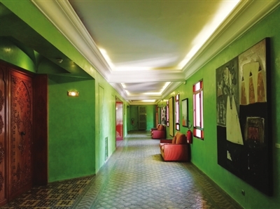 如果比较摩洛哥的国际品牌和本土品牌,感觉本土品牌在色彩运用上更多样少禁忌,许是摩洛哥早年归属法国又离西班牙近,受法国人的浪漫和西班牙人奔放的民族性格影响,虽全民信仰穆斯林,但宗教并没有限制他们对美的追求。在参观本土品牌SAADl酒店的客房时,记者看到每一层使用的颜色不同,一会儿全层都是蓝,一会儿全层都是绿,那蓝那绿上还精雕着细致的粉的白的花纹。从楼道到房门到房间,就算见多识广的记者,也惊叹不已,真是佩服设计师,简直是肆无忌惮呀!楼道是深湖蓝色,墙上挂着的大幅画作主调是藏蓝色;粉色墙面房门却是绿色的。身陷色彩之中,越看越觉得生动,和谐,高雅。